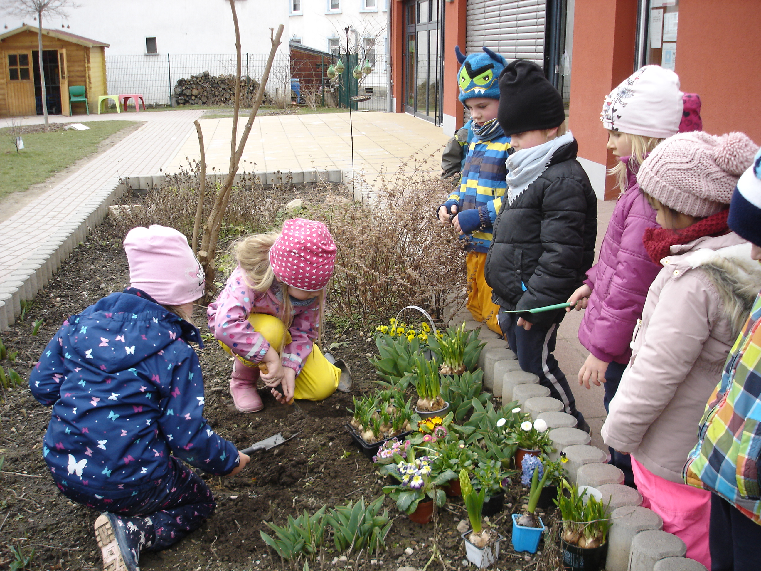 Neben stimmungsvollen Gedichten, Liedern und jahreszeittypischen Basteleien lockte uns die Sonne in den Garten. Alles duftete so schön und das Grün sah irgendwie besonders strahlend aus. Wir waren uns schnell einig: „Das muss wohl der Frühling sein!“ Alles beginnt zu wachsen und zu blühen. Auch wir wollen den Kindern die Möglichkeit geben so naturnah wie möglich aufzuwachsen. Innerhalb einer lebendigen Gartengestaltung ist dies am besten möglich. Schnell stand fest, es soll was Buntes und es soll etwas Leckeres dabei sein. Also setzten wir Erdbeer- und Himbeerpflanzen ein und pflanzten dazu noch viele bunte Frühjahrsblüher. Bei den Beeren freuen wir uns auf die spätere Ernte. Mit den Blumen konnte die Entdeckungsreise gleich beginnen. Wir suchten sie auf Wiesen und in Wäldern, wir betrachteten sie unter dem Mikroskop und ließen eine weiße Tulpe „blaues“ Wasser trinken um den Kindern zu zeigen, wie eine Pflanze Nährstoffe aufnimmt.